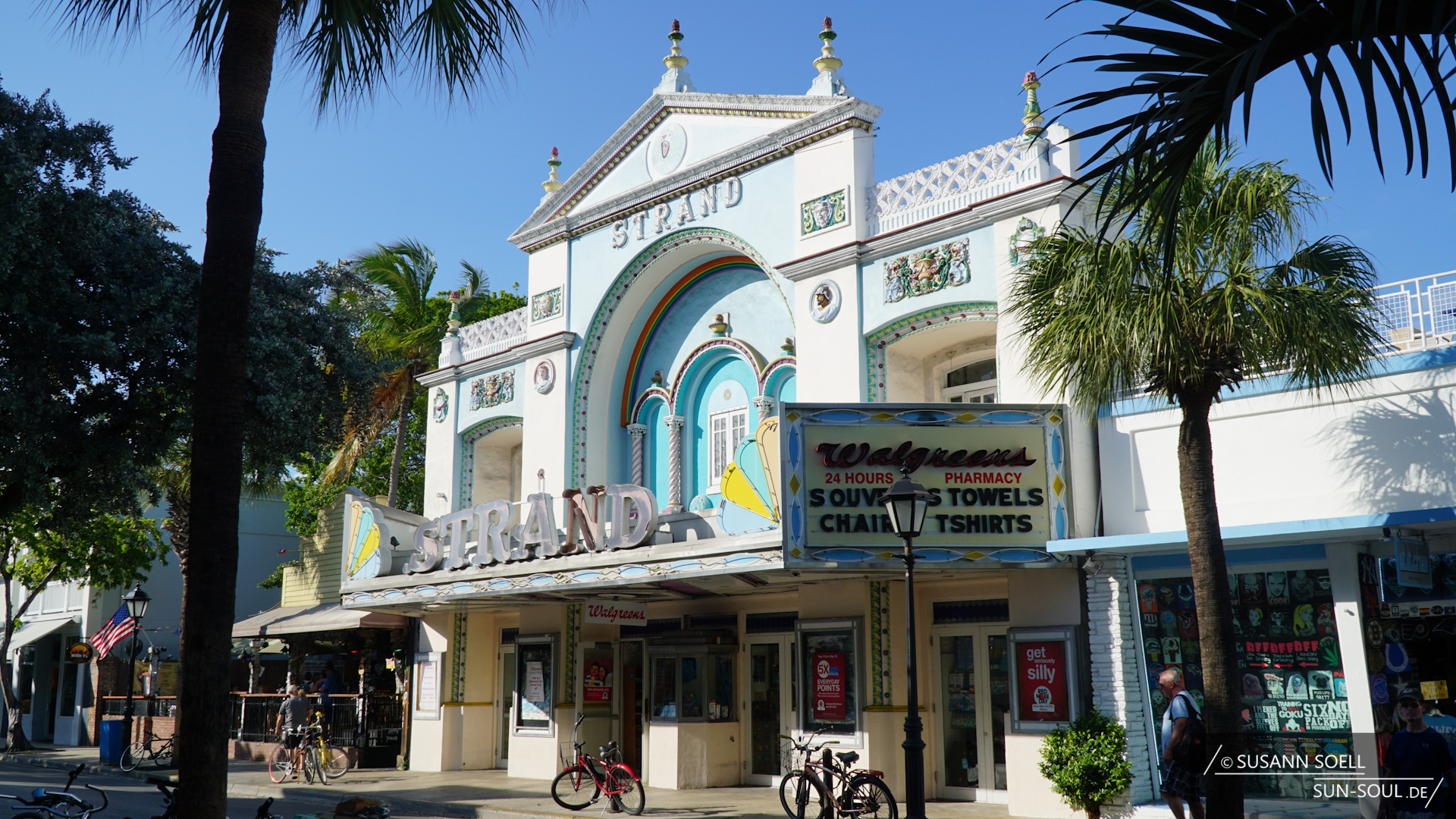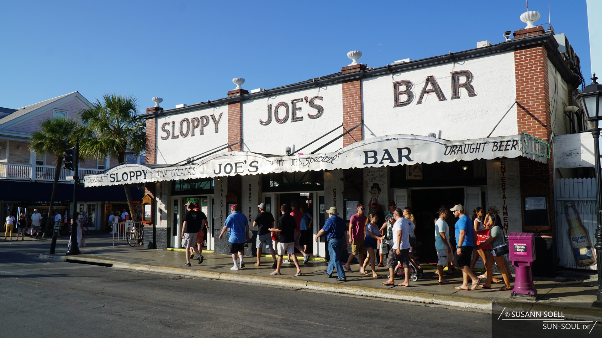 Wir laufen geradewegs die Duval Street in nordwestliche Richtung und fühlen selbst das außergewöhnliche Flair von Key West. Die zur Altstadt gehörende Straße bietet eine bizarre Mischung aus alten Gebäuden, wie dem aus dem Jahr 1918 stammenden Strand Theater (527 Duval St.), und bunten Souvenirläden.[9] Zwischendurch erinnern Bars und Kneipen, wie zum Beispiel das Sloppy Joe’s, an frühere Tage. Sloppy Joe bzw. eigentlich Joe Russell war Gelegenheitsschmuggler und eng mit Ernest Hemingway befreundet. Insbesondere aufgrund dieser Freundschaft ist das Lokal heute unter Touristen sehr beliebt – auch wenn es sich nicht mehr an seinem ursprünglichen Standort befindet (428 Greene Street).[9]