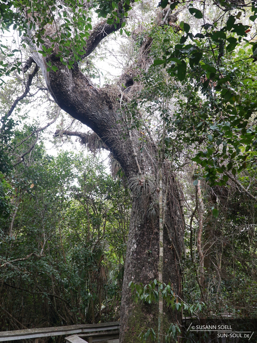 Bevor wir zum Hotel fahren und den Nationalpark für heute verlassen, machen wir einen letzten Abstecher zum Mahogany Hammock Trail. Über einen Holzsteg laufen wir über den Sawgrass Fluss und gelangen geradewegs auf die Bauminsel mit den typischen, westindischen Mahagoni-Bäumen, die teils Rekordhöhen erreicht haben.[5] Je weiter man dem insgesamt 700 Meter langen Pfad folgt, umso dichter kommt man den Baumkronen.