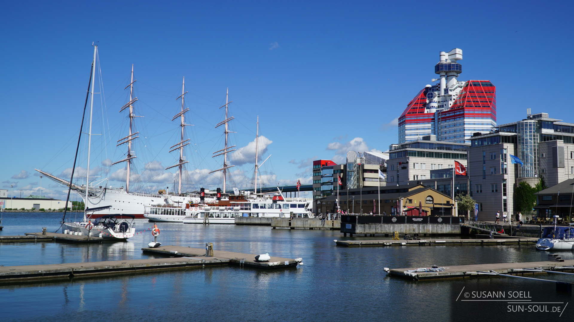 Uns zieht es zunächst in Richtung Wasser und den Lilla Bommens Hafen. Dort fällt unser Blick unweigerlich direkt auf das rot-weiße Hochhaus Skanska-skrapan. Der Büro- und Wohnkomplex[3] wird aufgrund seines Aussehens von den Göteborgern humorvoll „Lippenstift“ genannt und beherbergt in 86 Metern Höhe eine Aussichtsplattform. Von der „Götheborgsutkiken“ können Besucher auf den Hafen und die Stadt herabblicken.[4]