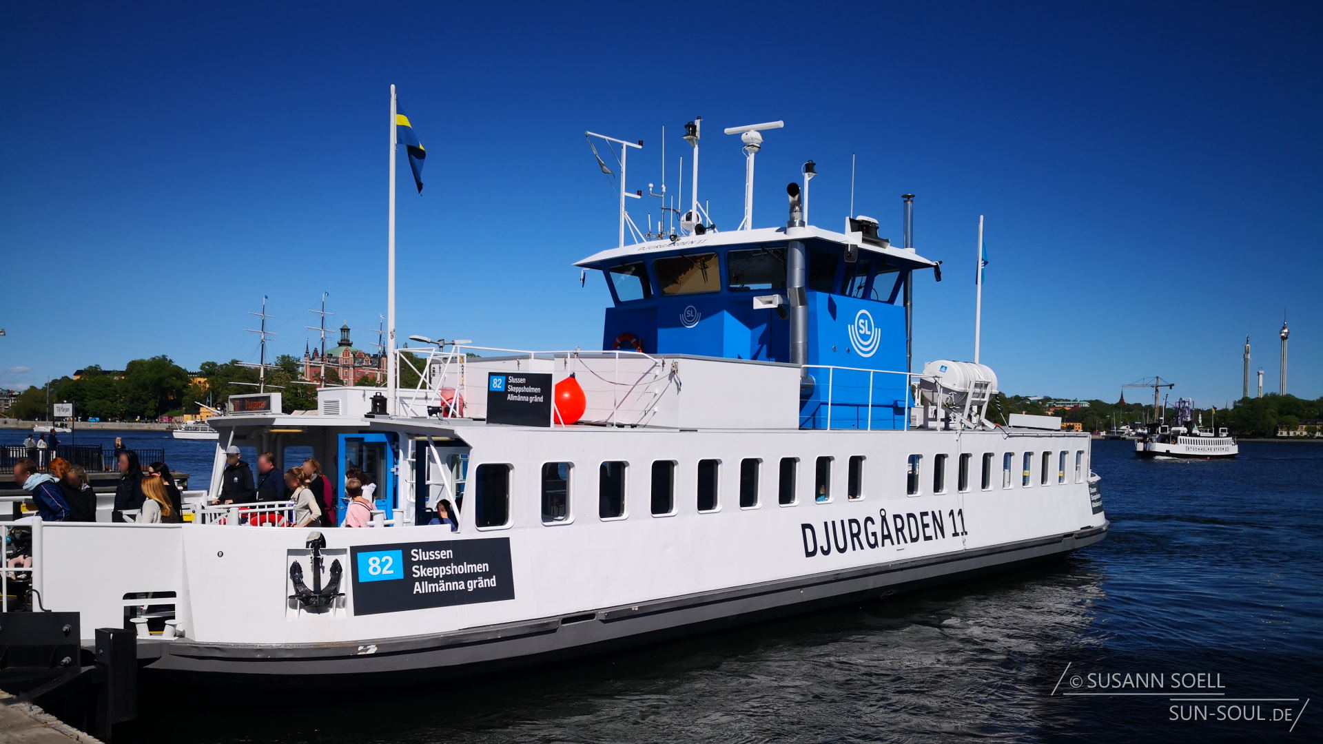 Das Wetter ist traumhaft schön und lädt zum Eis essen ein. Wir beobachten dabei die kleinen Fähren, die wie schwimmende S-Bahnen die verschiedenen Haltstellen am Ufer anfahren und ihre Passagiere ein- und aussteigen lassen. Die Neugier und Lust packt uns, sodass wir uns auf den Weg zur Haltestelle Slussen machen und dort mit der Fähre auf die Halbinsel Djurgården fahren. Herrlich, wie der Wind uns um die Nase weht. Knapp 10 Minuten später sind wir bereits am Ziel und legen an der Station „Allmänna Gränd/Gröna Lund“ an.