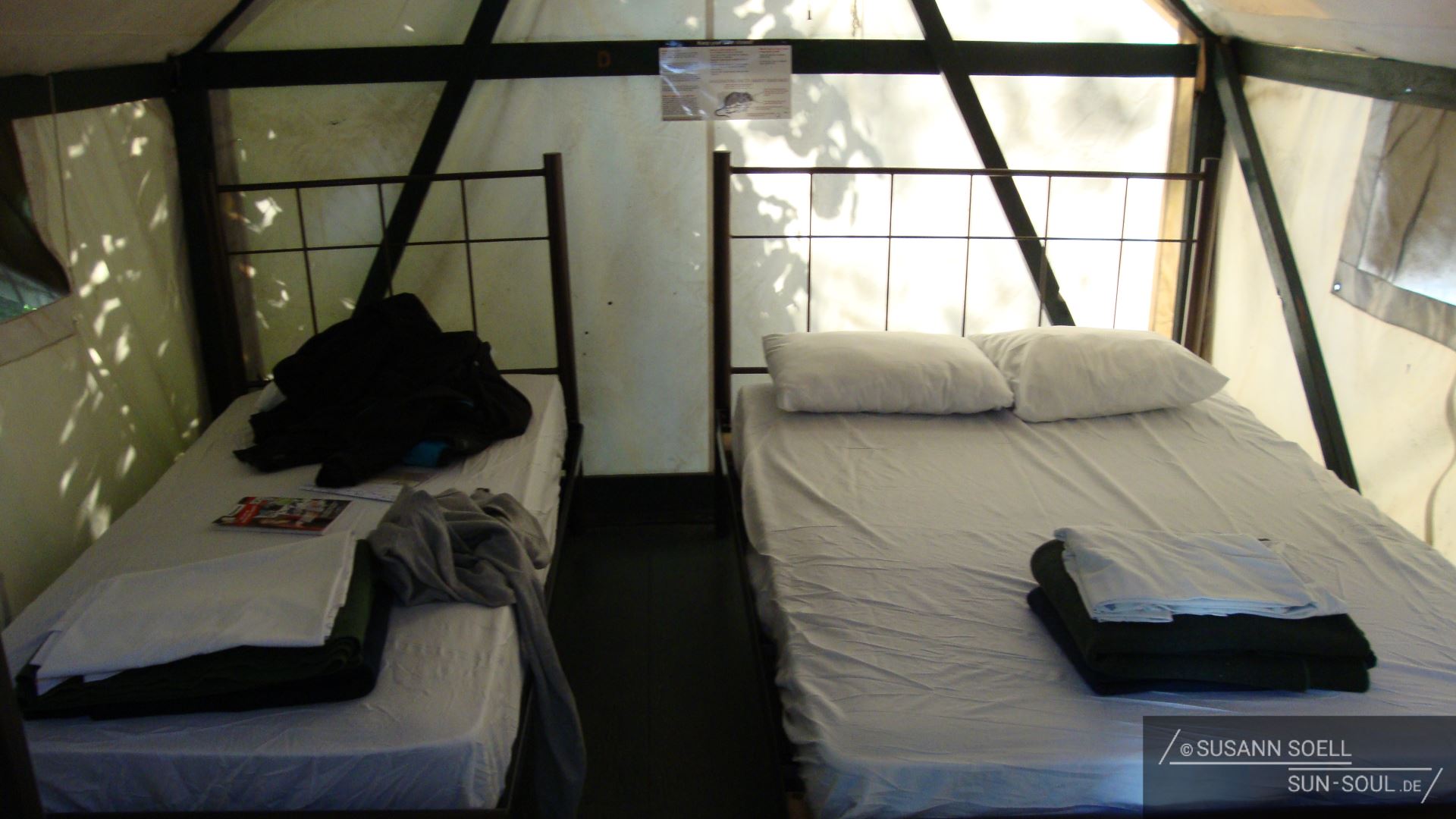 Am Nachmittag können wir unser sogenanntes Tent Cabin in Curry Village beziehen, wo wir die Nacht verbringen werden. Es ist eine Art spartanisch eingerichtetes Zelt mit zwei bis drei Liegen. Allerdings gelten sowohl im und vor dem Zelt als auch im gesamten Camp-Bereich sehr strenge Sicherheitsvorkehrungen, da neben (eher harmlosen) Mäusen auch Bären zu den regelmäßig gesichteten Campbesuchern zählen. Sie werden leider immer wieder von den verschiedenen Menschen- und Essensgerüchen angelockt.