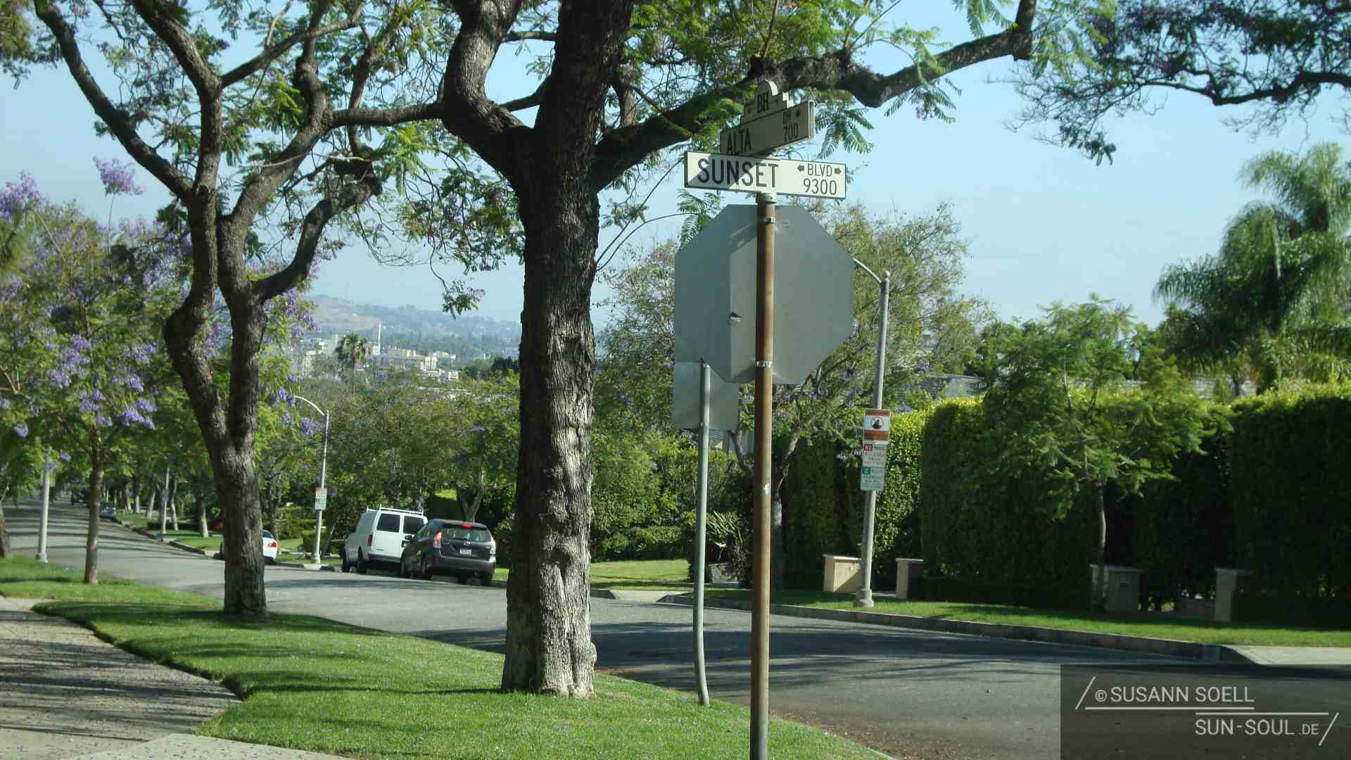 Und natürlich, nicht zu vergessen, hinauf zu den Hollywood Hills mit den neun großen, weißen, weltberühmten Buchstaben. Allerdings müssen wir feststellen, dass es viel schwieriger ist als gedacht, dem Schriftzug nahezukommen und ihn zu fotografieren. Nach vielen Versuchen, die zumeist in Einbahnstraßen enden, geben wir auf und nehmen mit einem der View Points Vorlieb. Ganz im Hintergrund und durch das Hitzeflimmern etwas verschwommen kann man auf dem Mount Lee „HOLLYWOOD“ erkennen – tatsächlich mit dem bloßen Auge besser als durch die Kamera. 🙂