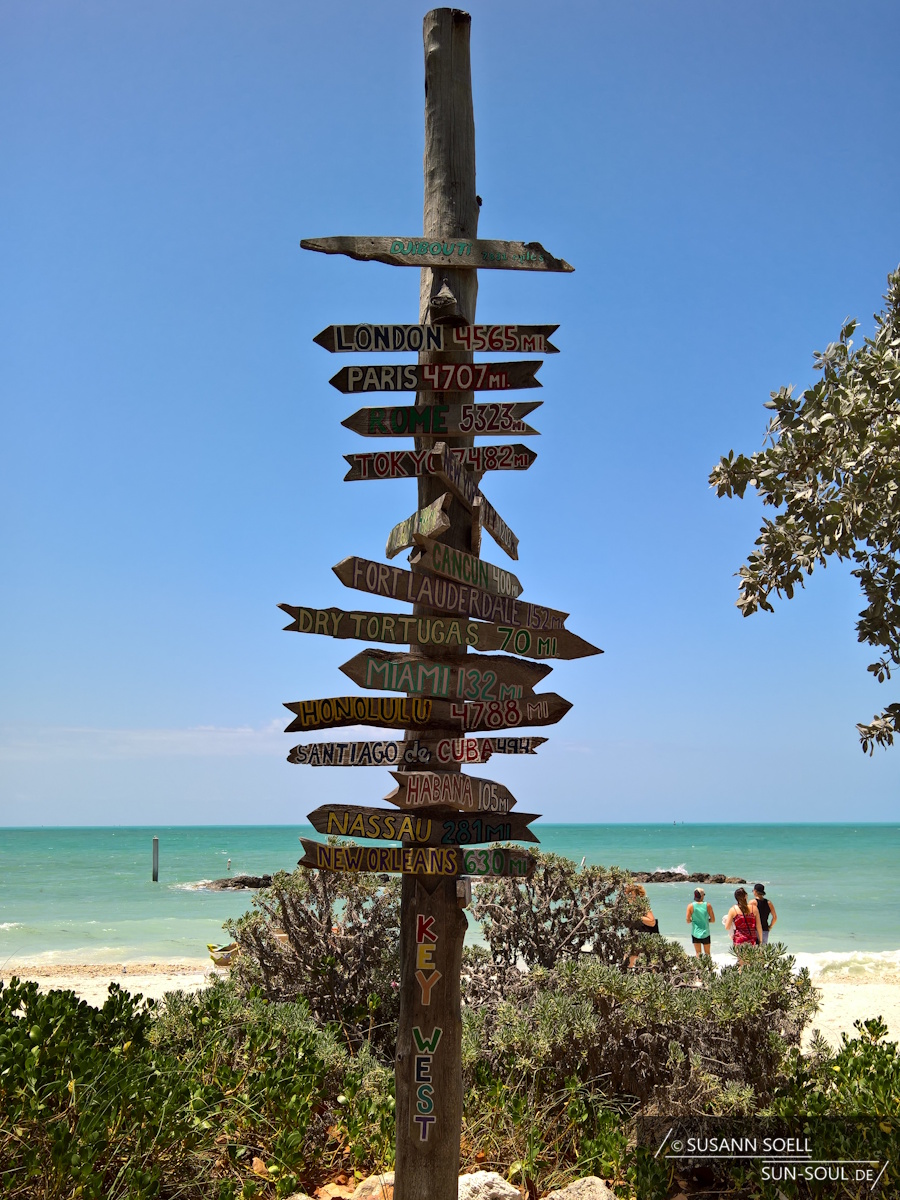 Die Sonne weckt uns und nach einem kleinen Frühstück stehen wir auch schon auf dem von den Wurzeln der Banyanbäume zerfurchten Bürgersteig und beginnen, den ersten Teil von Key West zu erkunden. Unser Hotel liegt im Südwesten. Unser erster Weg führt uns daher zum nur 350 Meter entfernten Southernmost Point. Er gilt als der südlichste Punkt der USA und als eines der meistfotografierten „Sehenswürdigkeiten“ von Key West. Von diesem Punkt aus sind es nur 90 Meilen (144 Kilometer) bis Kuba, sodass schon einige Menschen den Weg zum anderen Ufer schwimmend übers Wasser zurückgelegt haben.[1]