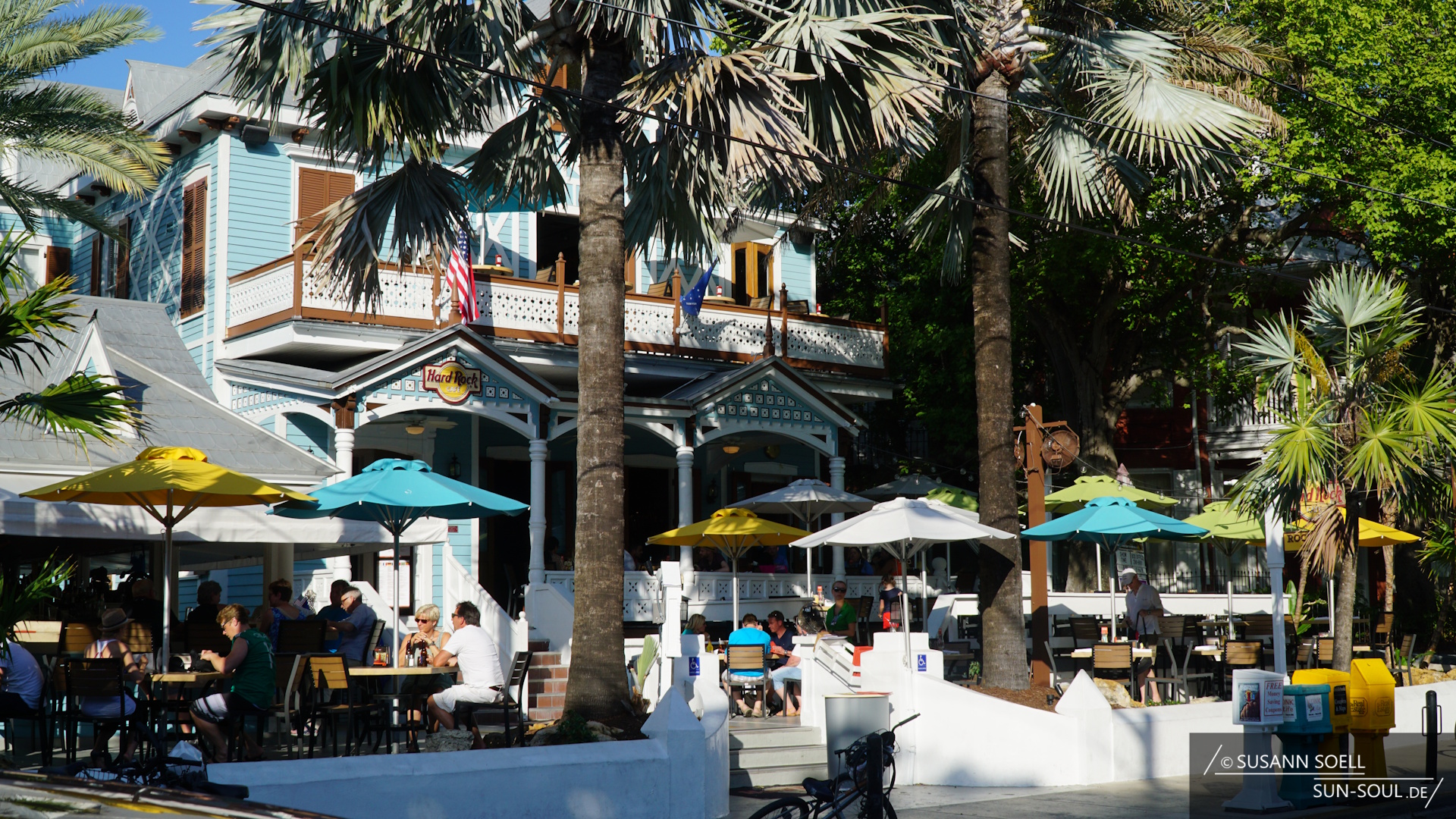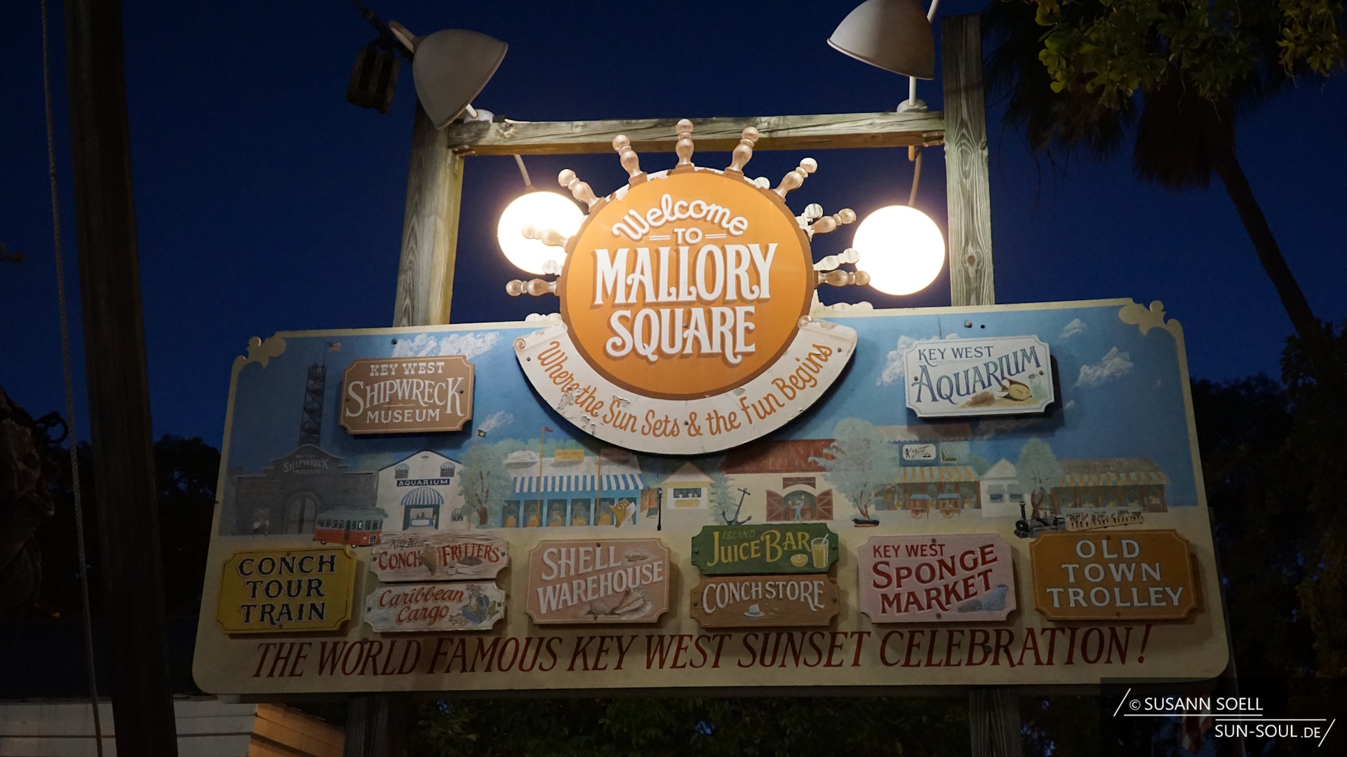 Am Ende der Duval Street biegen wir nach links zum Mallory Square ab. Während Händler ihre Waren feilbieten, Straßenkünstler ihr Können zur Schau stellen und Handleser in die Zukunft schauen, ist er vor allem Treffpunkt für ein allabendliches Ritual: Seit den 1960er-Jahren versammeln sich hier die Menschen, um die im Golf von Mexiko untergehende Sonne zu bejubeln und zu beklatschen. Egal, wie viele Menschen tatsächlich lauthals jubeln, der Blick ist traumhaft![10] Und macht deutlich, warum die Kubaner im 19. Jahrhundert die Insel „stella maris“ („Insel des Meeres“) nannten.[11]