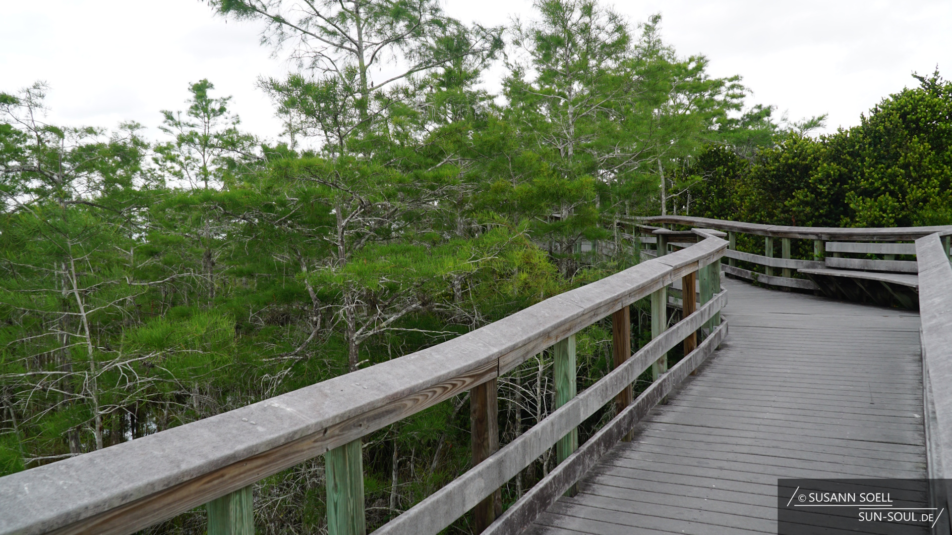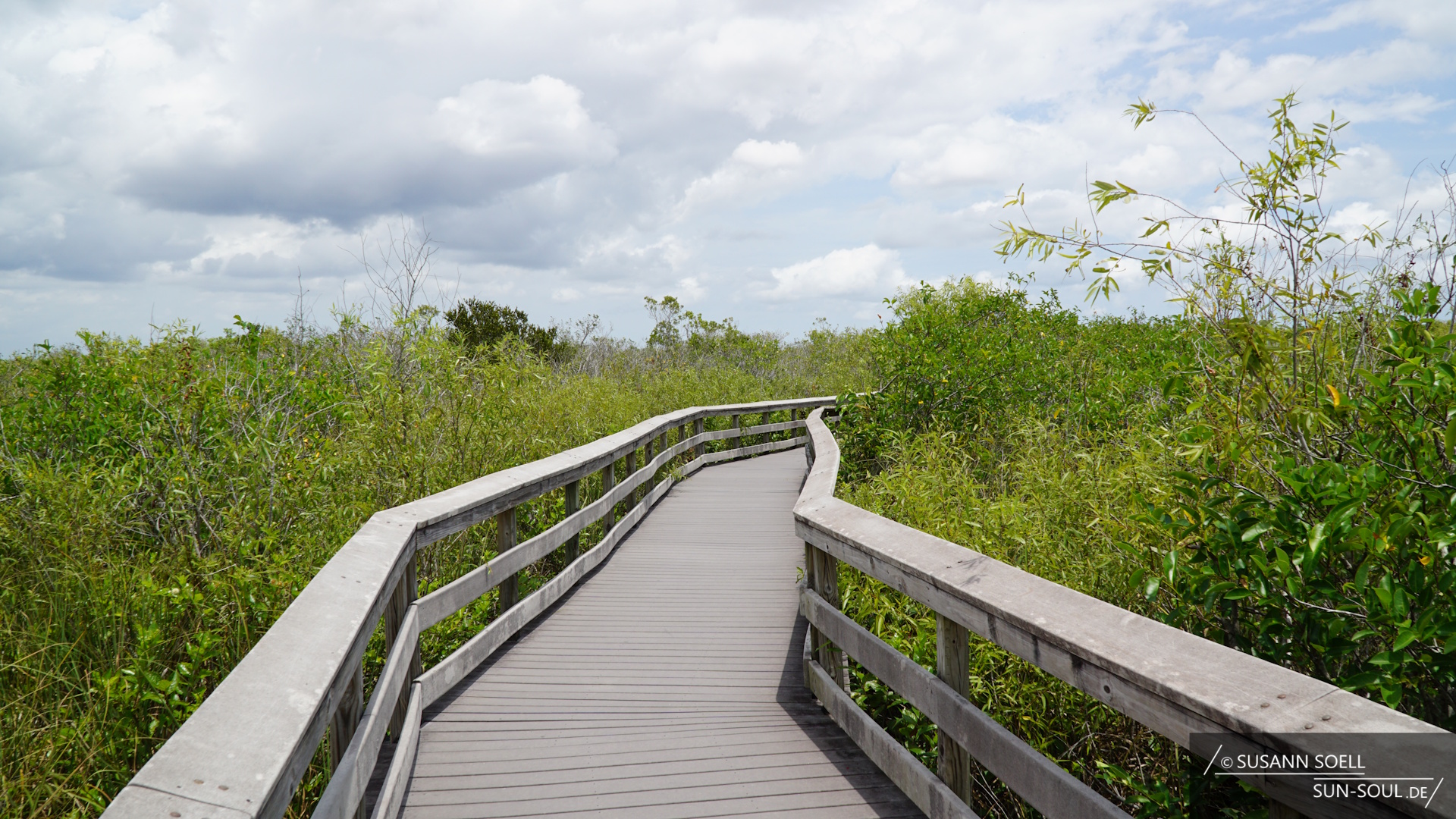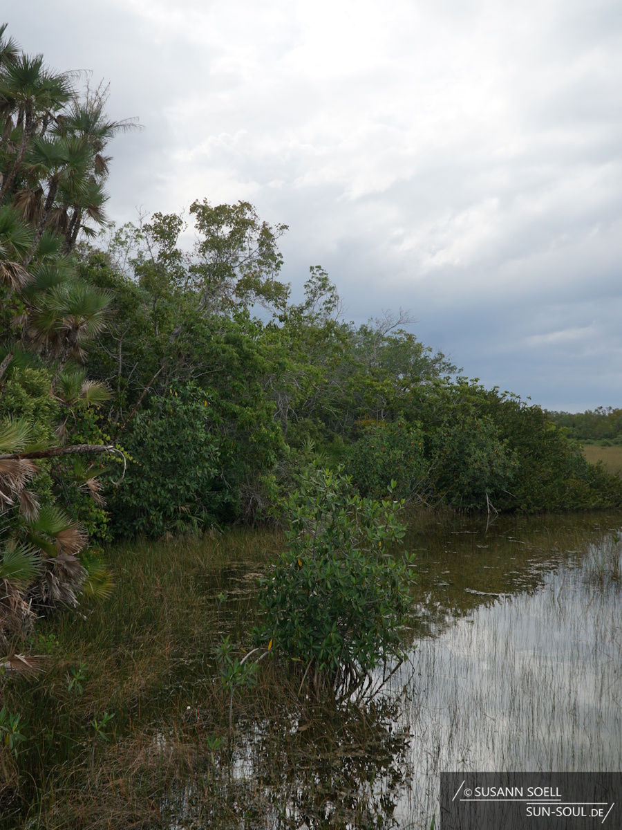 Zum anderen den Gumbo Limbo Trail, der nach den gleichnamigen, tropischen Gumbolimbo-Bäumen benannt ist, die neben Lianen, Orchideen und Farnen den Weg säumen.[3] 15 Kilometer weiter besuchen wir den Pa-hay-okee Overlook (sprich: „pa-je-o-qui“, was so viel bedeutet wie „Fluss aus Gras“).[2] Je nach Saison sieht die Umgebung mal trockener und mal grüner aus. Während wir über die Holzplanken laufen, die auf halber Strecke des Trails zu einem Aussichtsturm führen, bietet sich uns ein wunderbares Bild über die Feuchtsavanne. Die Plattform fühlt sich inmitten der Baumkronen wie ein Baumhaus an.