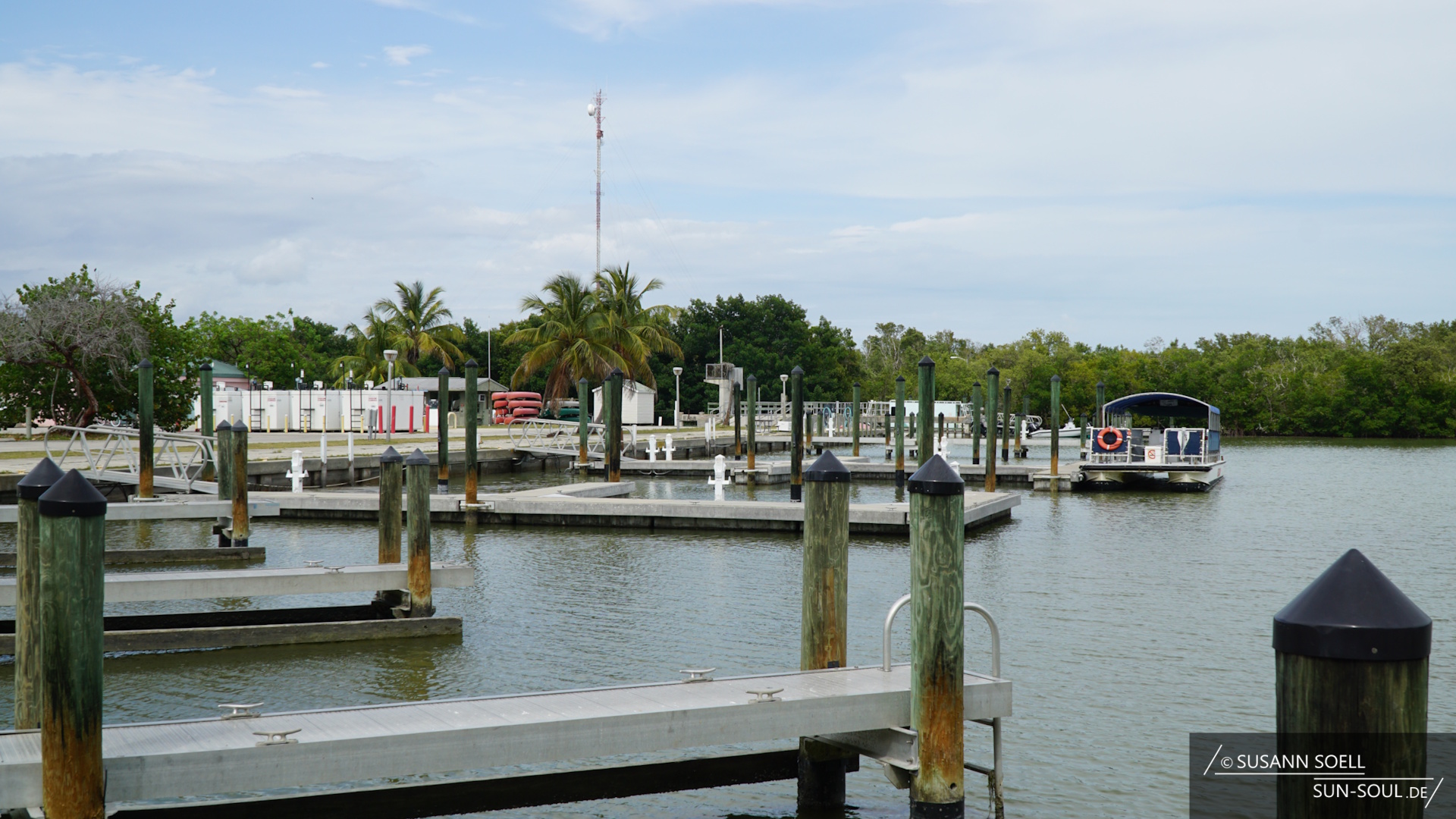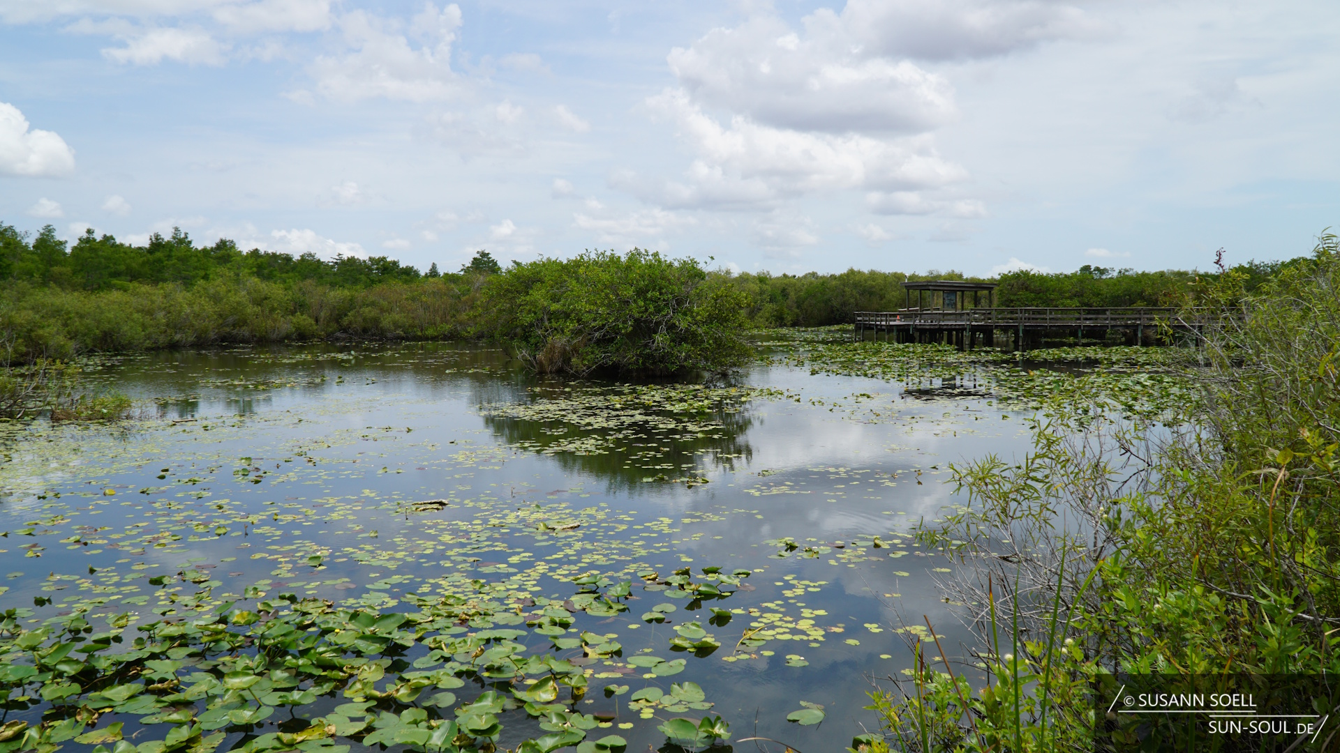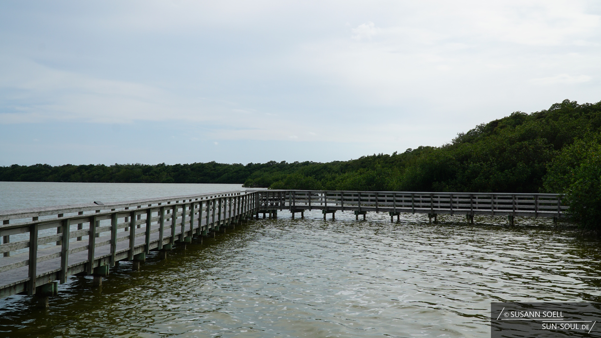 Zum anderen den Gumbo Limbo Trail, der nach den gleichnamigen, tropischen Gumbolimbo-Bäumen benannt ist, die neben Lianen, Orchideen und Farnen den Weg säumen.[3] 15 Kilometer weiter besuchen wir den Pa-hay-okee Overlook (sprich: „pa-je-o-qui“, was so viel bedeutet wie „Fluss aus Gras“).[2] Je nach Saison sieht die Umgebung mal trockener und mal grüner aus. Während wir über die Holzplanken laufen, die auf halber Strecke des Trails zu einem Aussichtsturm führen, bietet sich uns ein wunderbares Bild über die Feuchtsavanne. Die Plattform fühlt sich inmitten der Baumkronen wie ein Baumhaus an.
