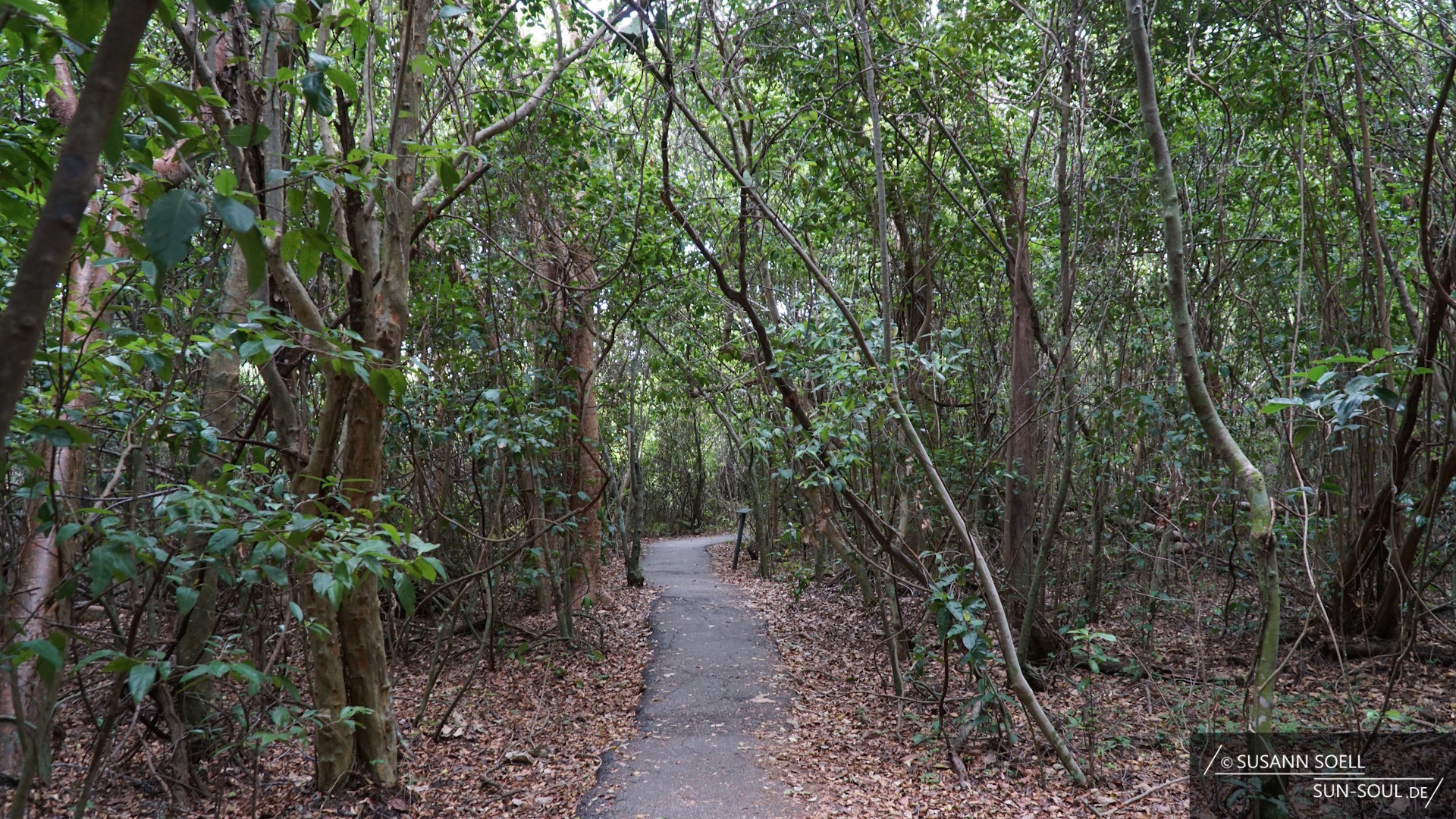Bevor wir zum Hotel fahren und den Nationalpark für heute verlassen, machen wir einen letzten Abstecher zum Mahogany Hammock Trail. Über einen Holzsteg laufen wir über den Sawgrass Fluss und gelangen geradewegs auf die Bauminsel mit den typischen, westindischen Mahagoni-Bäumen, die teils Rekordhöhen erreicht haben.[5] Je weiter man dem insgesamt 700 Meter langen Pfad folgt, umso dichter kommt man den Baumkronen.