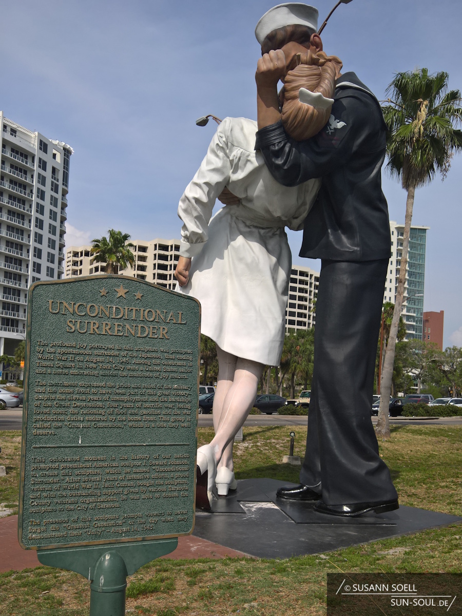 Auf diese Weise erlangte Sarasota den Beinamen „Stadt der Künste“. Das versucht Sarasota auch an vielen anderen Plätzen und Orten immer wieder zu bekräftigen. Direkt am Bayfront Park steht eine 25 Fuß hohe Statue namens „Unconditional Surrender“ des Bildhauers J. Seward Johnson. Sie zeigt einen amerikanischen Seemann, der während der Feierlichkeiten auf dem Time Square in New York City nach dem Ende des Zweiten Weltkrieges eine Krankenschwester umarmt und küsst. Da die Statue bequem erreichbar ist, stellt sie ein sehr beliebtes Fotomotiv dar – und es ist gar nicht so einfach, sie mal ohne Touristen abzulichten.