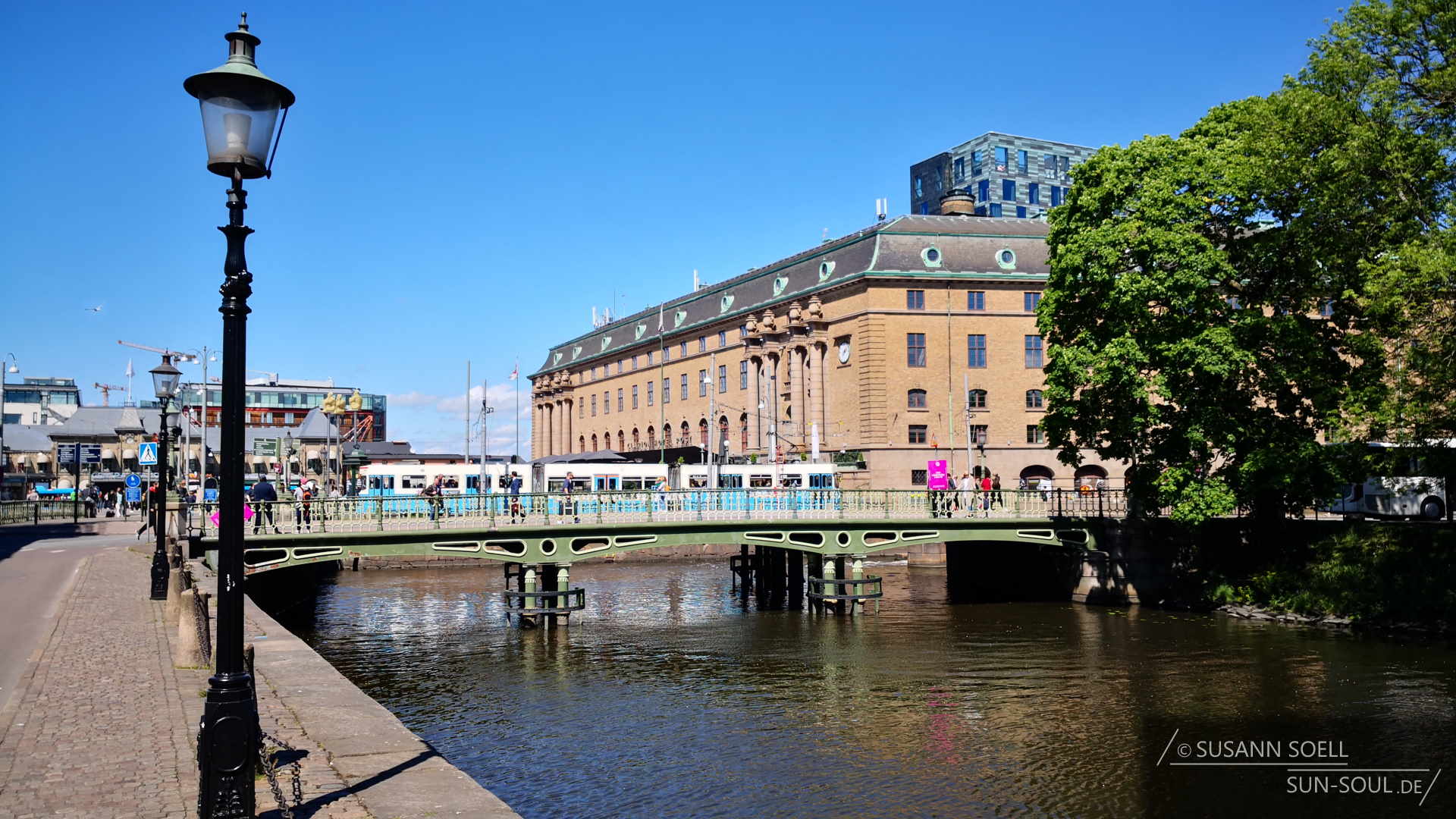 Als stolze Besitzer zwei gültiger Fahrkarten begeben wir uns erneut zum richtigen Steig, warten auf den nächsten Bus und fahren dieses Mal tatsächlich bis ins Zentrum von Göteborg. Vor dem Bahnhof steigen wir aus und folgen einem selbst gewählten Weg durch die 525.000 Einwohner große Stadt.[1] Göteborg liegt am Südufer der Mündung des Göta älv (Göta-Fluss) und wurde auf Wunsch des „Stadtplaners“ Gustav II. Adolf von Spezialisten aus Holland mit zahlreichen Kanälen durchzogen. Erst damit war die zukünftige Bebauung möglich.[2]